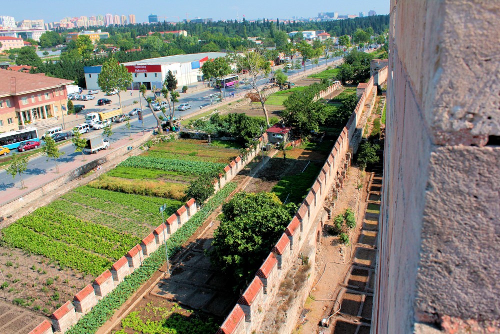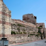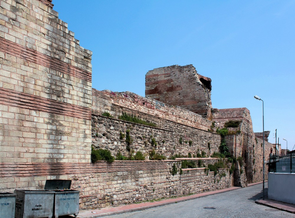 Deutlich besser erhalten ist die Landmauer, die unter Theodosius II. im 5. Jahrhundert errichtet wurde. Sie riegelt die offene Landseite der Stadt ab und hat eine Länge von 6,7 km. Die dreiteilige Konstruktion aus Graben, Vormauer und Hauptmauer galt als unzerstörbar. Sechs große Tore, die alle erhalten geblieben sind, führen in die Stadt.